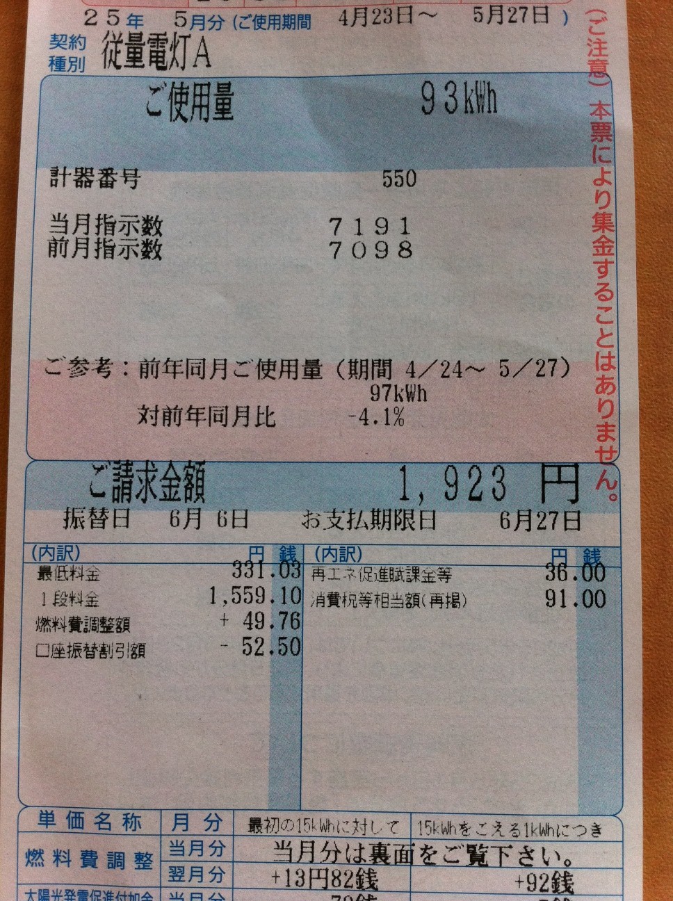 先月の使用量が68kWhでしたので、先月より25kWh増えました。。