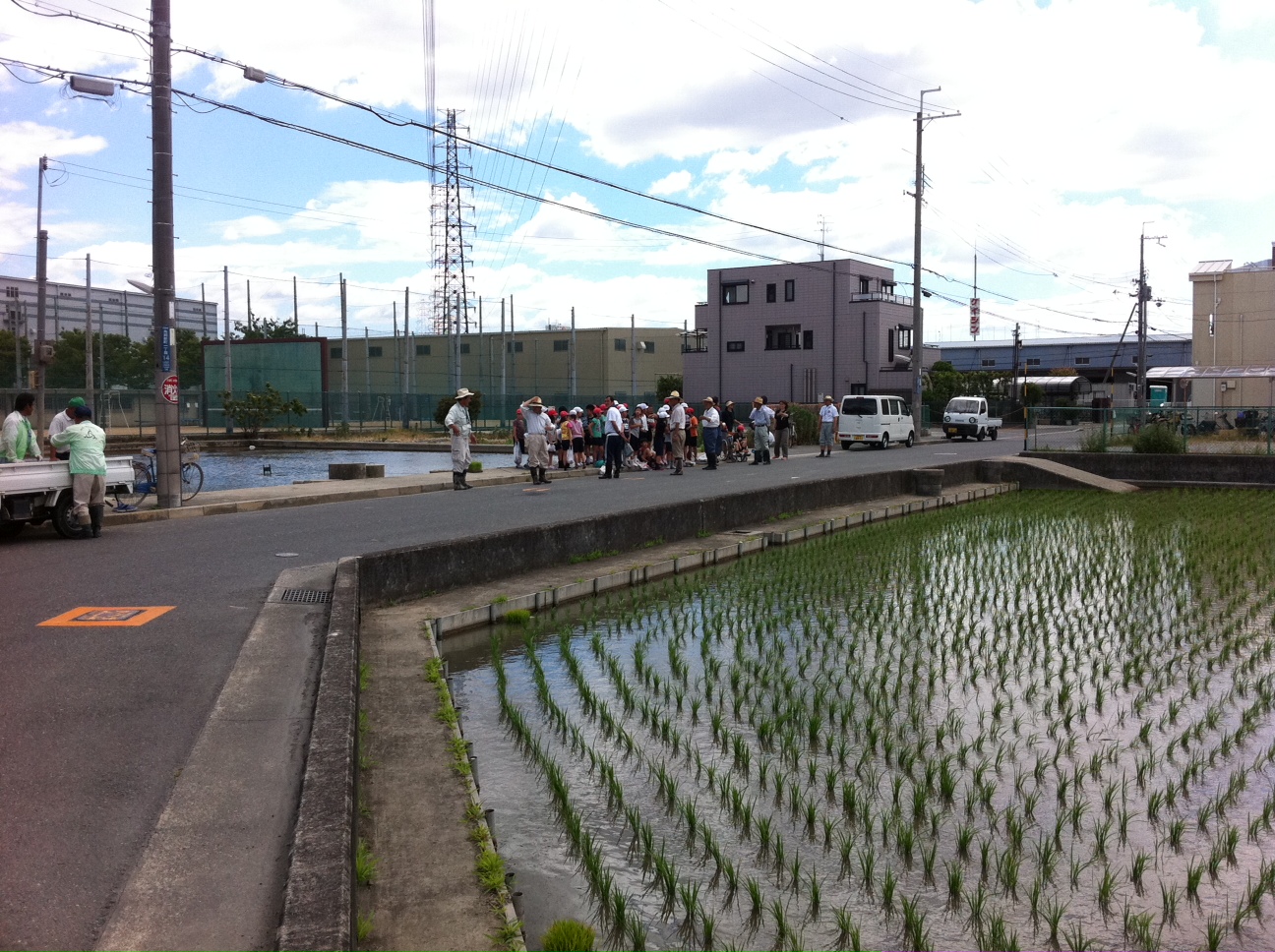 事務所近くの田んぼでは、小学生が田植えの体験学習をしていました。