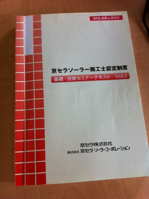先週の金曜日に、京セラソーラー基礎セミナーに参加しました。 9:30~17:30まで、丸一日かけて行い、きっちりと知識を詰め込んできました! このセミナーでは、太陽光パネルの仕様から、施工方法、電気工事まですべてを説明してくれるので、半年間で覚えてきたことを、総復習することができました。 施工方法の細かなところで、まだわからない部分が多少あるのですが、これから、施工現場への立ち合いや、勉強会へ参加で、知識をつけていきたいと思います。 来週の施工現場が楽しみです!また、報告します!