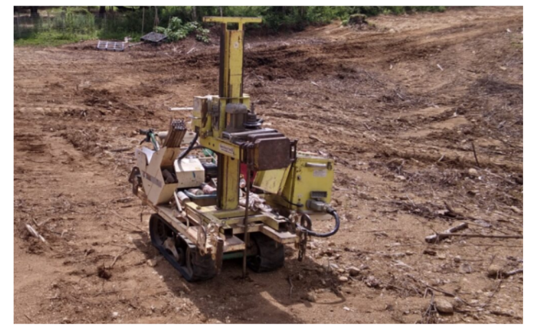 ドリル状のロッドを地面に対して回転させながらめり込ませて、25cm めり込むのにかかる回転数から、地盤がどれくらい硬いかや、引き締まっているかを測定します。この結果を、標準貫入試験での打撃回数に換算して、換算 N 値を求めています。